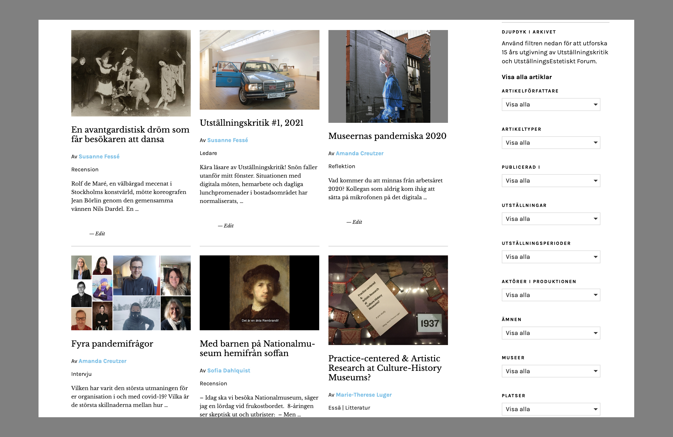 Till att börja med kan jag stolt meddela att vi nu slår upp portarna till vårt sökbara arkiv, med samtliga artiklar från UtställningsEstetiskt Forum (2005–2018) och Utställningskritik (2018–2021). Med hjälp av ett bidrag från Riksantikvarieämbetet har vi under ett års tid sammankopplat olika digitala textformat i ett och samma arkiv, som är sökbart på såväl årtal som platser, medverkande aktörer och ämnesord. Läs mer om arbetet i en text skriven av Aron Ambrosiani.