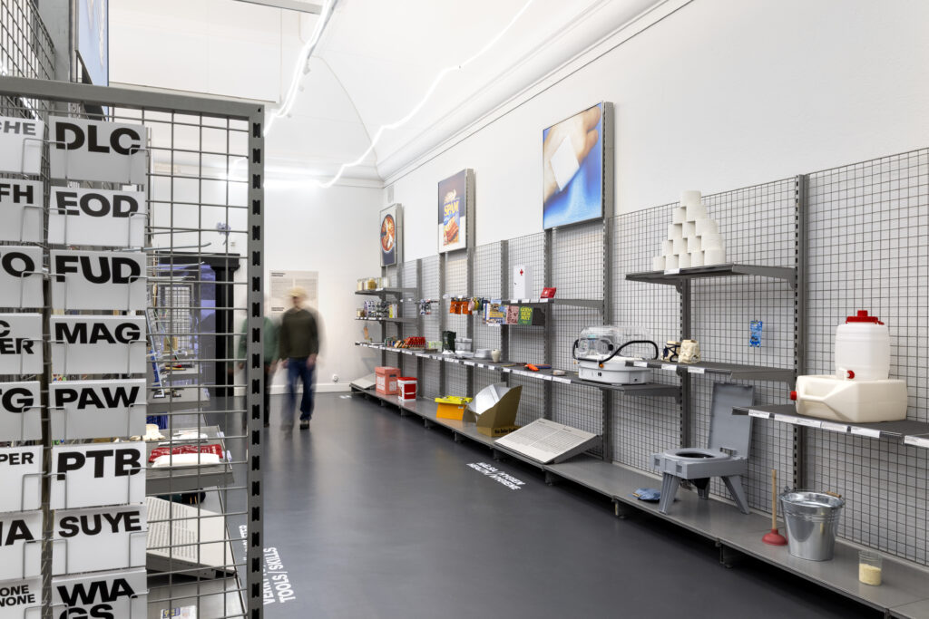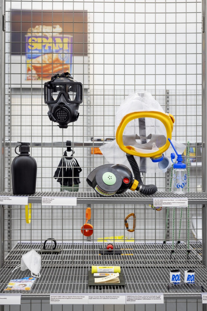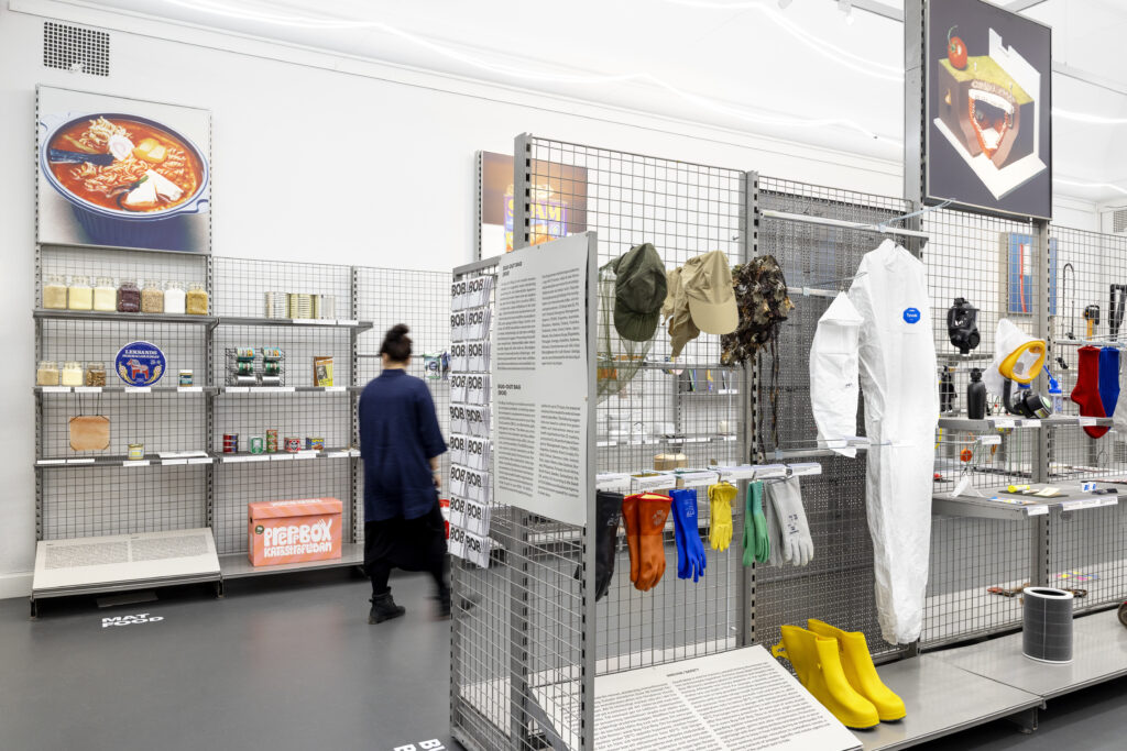 Nästkommande del om individuell prepping – ”The Prepper Supermarket” – är mer gripbar i sin innebörd. Här handlar det om konkret överlevnad. Det första besökaren möter är en text om ”BUG-OUT BAG.” Ordet var främmande för mig (vilket kanske säger mer om min egen beredskap) men syftet med väskan enkelt. Väskan skall rymma de väsentliga förnödenheterna som behövs för att klara sig på egen hand i minst 72 timmar innan (förhoppningsvis) statliga insatser kan ta vid. Nog går det att fylla väskan mer än väl i en ”prepper supermarket”. Här spelar föremålen en självklar huvudroll. Utplacerade på varuhyllor likt en lagerbutik är de tematiskt uppdelade efter funktion och bruk. I rubriker på golvet kopplas föremålen samman med de överlevnadsbehov de fyller: mat, hygien, verktyg och färdigheter, överlevnadskit, skydd och säkerhet och kommunikation. Att gestalta denna del som en supermarket har sina uppenbara poänger. Kommer krisen blir jag då sist fram till tomma varuhyllor? Ett individualiserat massbeteende är en del av konsumtionssamhället också under lugnare tider. Yxor, knivar, syetuin, kompasser, första hjälpen-tourniquet, kommunikationsradior med mera. Majoriteten av föremålen på hyllorna har ingen vardaglig förankring i den värld jag nu (över)lever i. Vet jag ens hur jag använder allt? Tyvärr väcks inte min nyfikenhet, inte ens att jag förundras över den smarta design som föremålen kanske vittnar om. Bland hyllorna står en skärm som visar reklamfilmer från USA där privatpersoner kan införskaffa sitt eget skyddsrum för 20 000 dollar; eller erbjuds köpa in sig på ett projekt som kan tillgodose lyxlivstillvaro i bunker när världen utanför går under. Insikten om min bristfälliga kompetens i överlevnadskunskap och pengarna jag kan behöva om någon annan skall bistå mig vid undergången ger mig ångest. Mitt ointresse för prepping och stresspåslaget gör att jag vill fly från ”the prepper supermarket”. Kan hotet på grund av mina individuella tillkortakommanden lindras av tilliten till myndigheter och stat? Är utställningens sista del ”Myndigheters beredskap” en bra tillflyktsort?