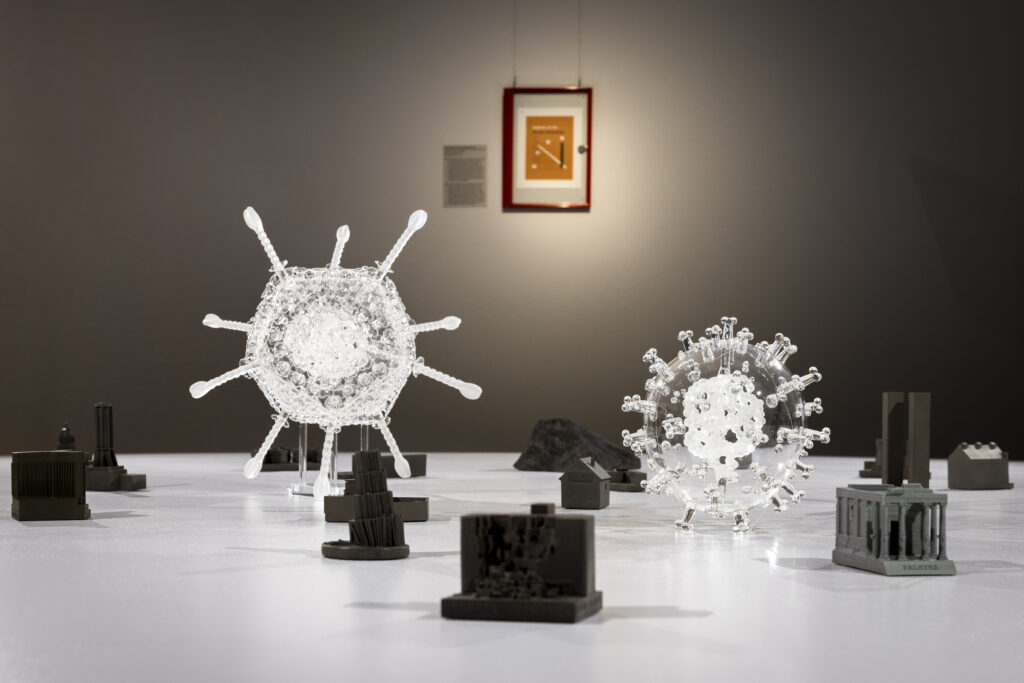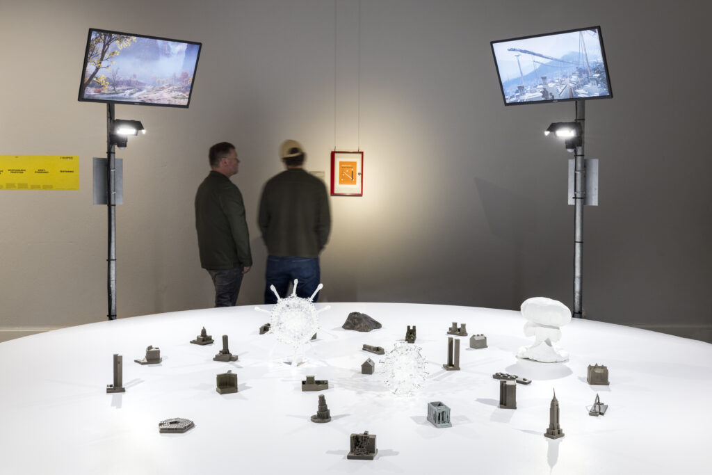 Den inledande delen består av den historiska exposén och ett stort vitt bord. Ovanför hänger fyra skärmar med postapokalyptiska scener från olika tv‑spel. På bordet står två glasskulpturer i form av covid‑19‑viruset och dess vaccin, samt ”The Huggable Mushroom” – ett litet svampmoln i polyester skapat i terapisyfte för att konfrontera rädslan för kärnvapenkrig. På bordet ligger även ”Souvenirs for the End of the Century: Buildings of Disaster”. Dessa ”souvenirer” består av 23 miniatyrbyggnader som förknippas med dramatiska och omvälvande händelser av vitt skilda slag. Här nämns endast några exempel: The Dakota Apartments i New York (John Lennons bostad, utanför vars port han sköts i december 1980). Pont de l’Alma‑tunneln i Paris (där prinsessan Diana omkom i en bilolycka 1997), kärnkraftverket i Harrisburg, Twin Towers i New York, Unabomber‑stugan, Osama bin Ladens hus i Abbottabad och Lorraine Motel i Memphis (där Martin Luther King blev skjuten 1968). En av miniatyrerna visar O.J. Simpsons Ford Bronco, bilen som stod i centrum för den tv‑sända biljakten sommaren 1994, då Simpson var misstänkt för mordet på sin ex‑fru. Installationen kan tolkas som att atommolnet och pandemierna är de ”riktiga” hoten. Hot med ödesdigra globala konsekvenser. Souvenirer skaffar vi däremot för att minnas. Miniatyrerna påminner om sådant som i efterhand skulle blekna när de verkliga katastroferna kommer.