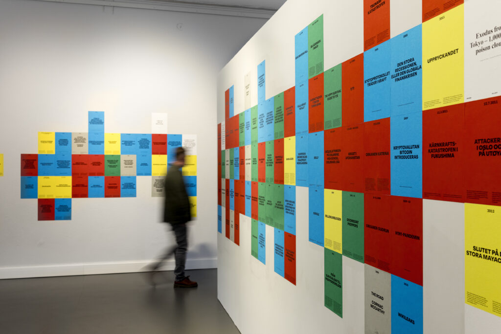 På tre väggar, två fasta och en fristående, berättas denna historia genom små rektanglar i vitt, blått, rött, grönt, grått och gult, i kronologisk ordning. Eftersom allt är kodat i färg blir man benägen att kategorisera alla dessa händelser och företeelser i termer av hot och riskbedömning. Tidsresan startar 2800 f.Kr. med assyriska stentavlor som förutspår jordens undergång till USAs bortförande av Venezuelas president Maduro. Däremellan ryms allt mellan naturkatastrofer, epidemier, politiska och sociala omvälvningar, uppfinningar och olika uttryck för prepping.