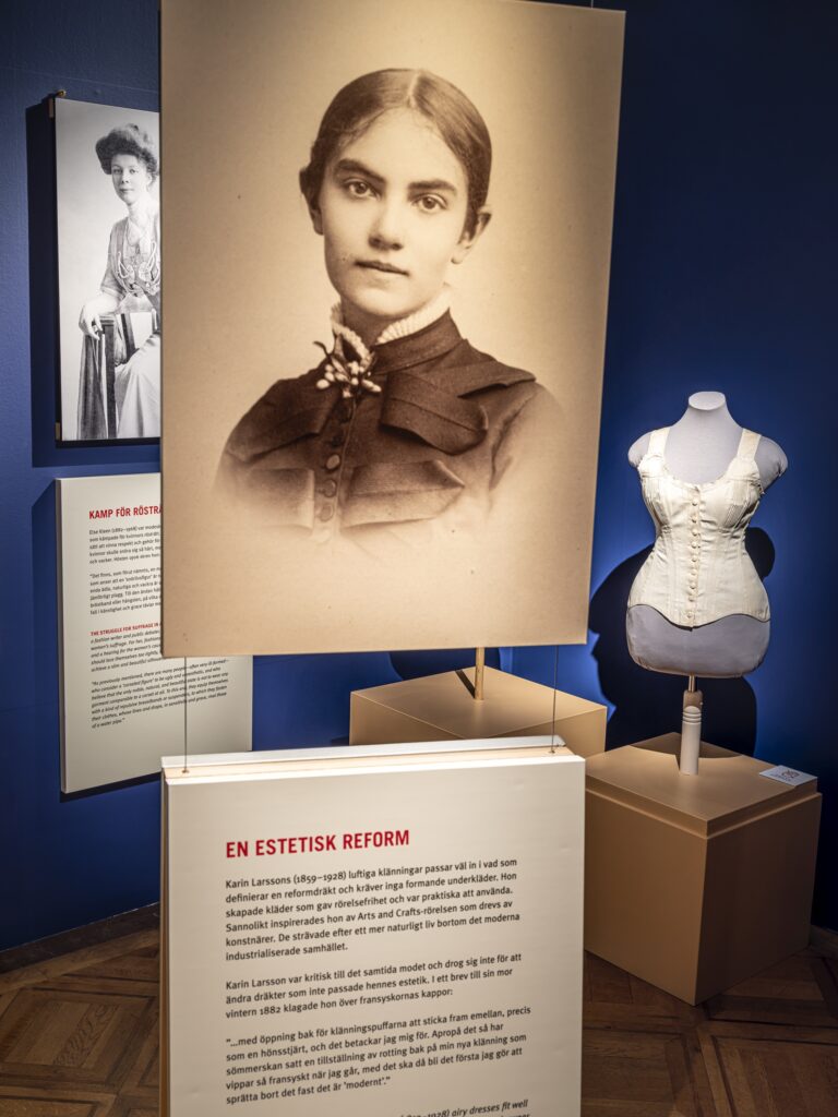 För att ytterligare framhäva konfliktperspektivet får fyra historiska aktörer komma till tals med sina sinsemellan motstridiga tankar om korsetten. Sveriges första kvinnliga läkare Karolina Widerström ville ersätta korsetten med det mer bekväma och hälsosamma reformlivet. Karin Larsson designade reformdräkter, bekväma plagg varav två inlånade klänningar visas i utställningen. Samhällsdebattören och modeskribenten Else Kleen menade istället att den moderiktigt korsettformade kroppen var en förutsättning för att kvinnor skulle tas på allvar i rösträttskampen.