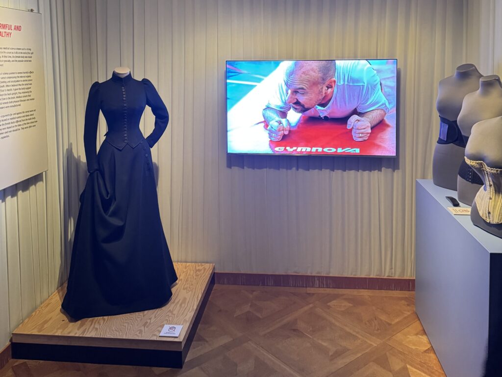 Att det ändå fungerar så väl som det gör tror jag beror på att utställningsidén handlar om att gestalta historisk forskning, snarare än att turnera ett särskilt föremålsurval. Korsetterna från Textilmuseets studiesamling är nyckelföremål, men jämfört med inmärkta museiföremål kräver de inte samma omhändertagande. Som Textilmuseet själva skriver: ” Trots – eller kanske just på grund av – sin status som icke-museiföremål är rekvisitan är en viktig del av museets samlingar. Den gör det möjligt för besökare att själva prova och känna på äldre textilier och kläder på ett sätt som inte går att göra med vanliga museiföremål.” Varje museum med en dräktsamling från sekelskiftet kan stå värd för denna utställning och jag räknar med att turnén fortsätter.